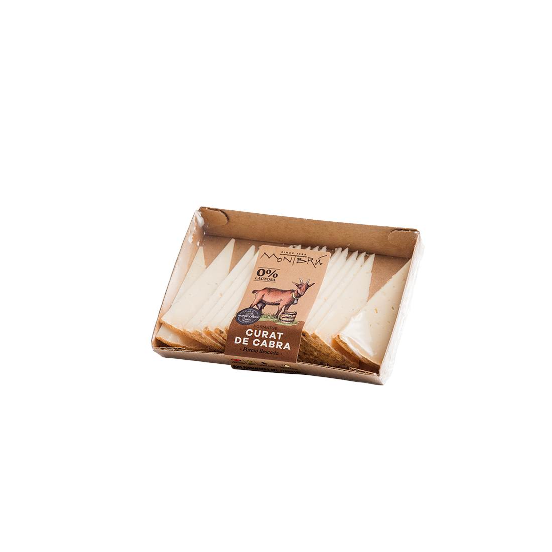 Sliced portions of goat cured cheese packed in a tray under modified atmosphere.